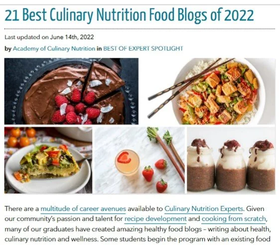 I am honoured and thrilled to be included on this prestigious list of the 21 Best Culinary Nutrition Food Blogs of 2002 in the Academy’s Best of Expert Spotlight.