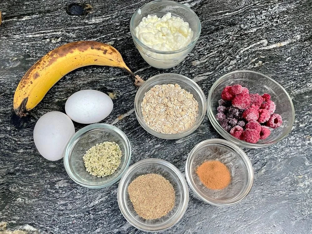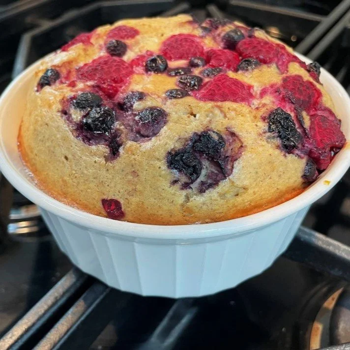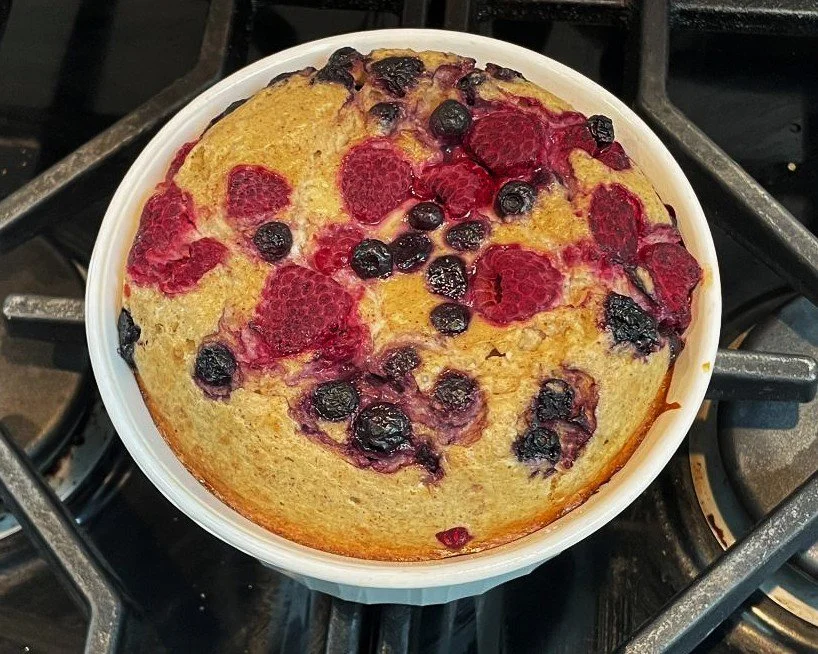 Cottage cheese is having a long moment due to its protein richness and I am a fan! This is a great protein bowl to start your day or enjoy for a snack or even a dessert! Combined with the oats and eggs in this recipe make this a protein and fibre rich delight! There is no added sweetener other than the banana and berries – they are all you need. Yet you can always add a splash of maple syrup or honey when serving! Warm from the oven or cool from the fridge – both are great.