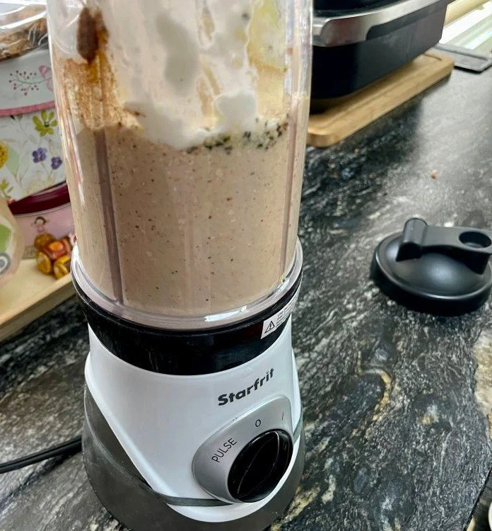 Add all ingredients, except the berries, to a blender (bullet type or regular blender) or a food processor, and blend until smooth.