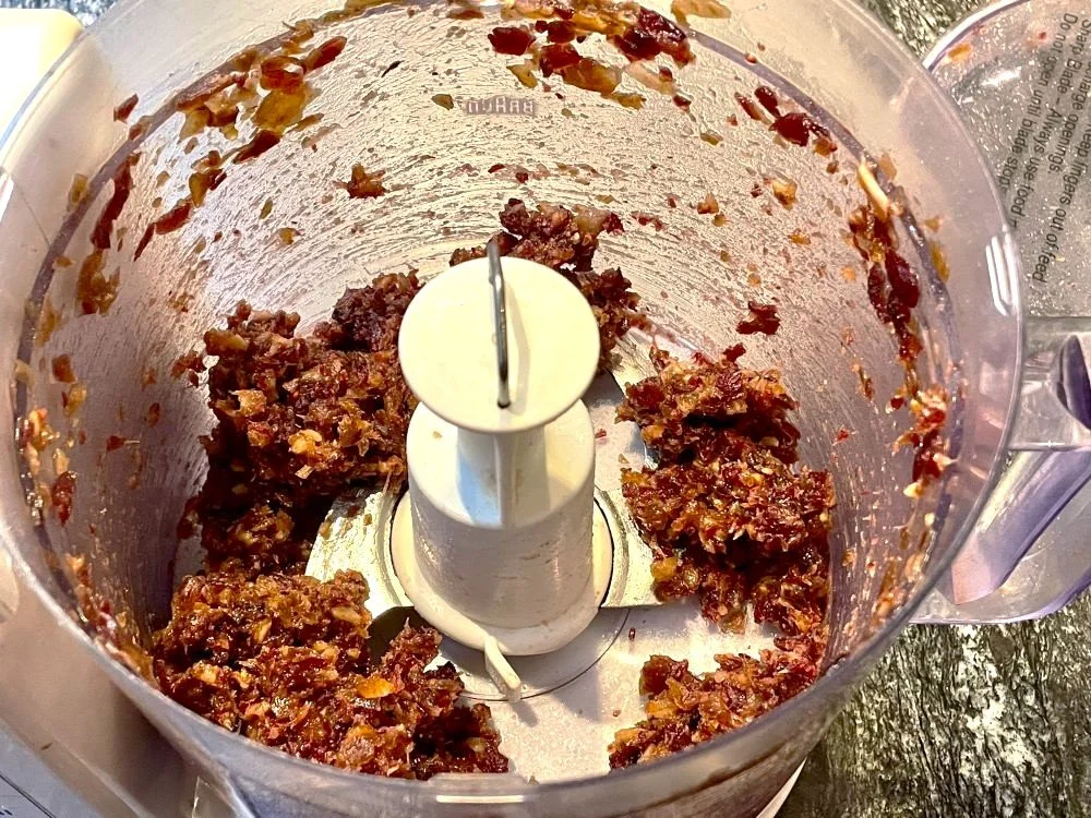 Add the dates and craisins to your food processor and whirl until broken down and starting to become smooth.