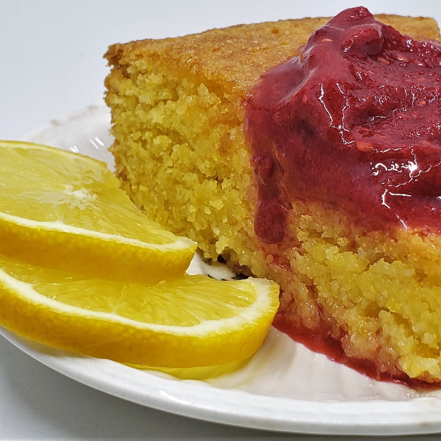 To make the raspberry purée, mash with a fork, or in a blender to make it super smooth, 2 cups of fresh or thawed frozen raspberries. Add a tablespoon of maple syrup or honey for sweetening (as raspberries can be quite tart). Spoon the purée over the plated slice! Very thin slices of lemon on the cake before cutting (I was too eager to cut into this deliciousness to include a photo of that!) or on the plate with the slice of cake makes a pretty garnish!
