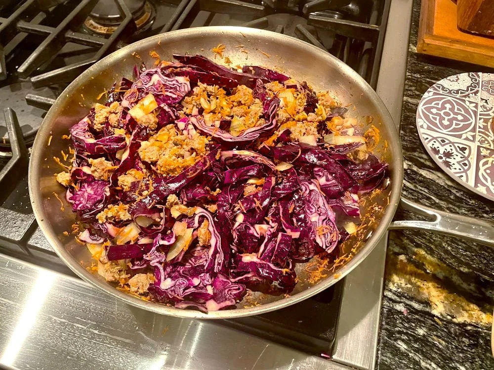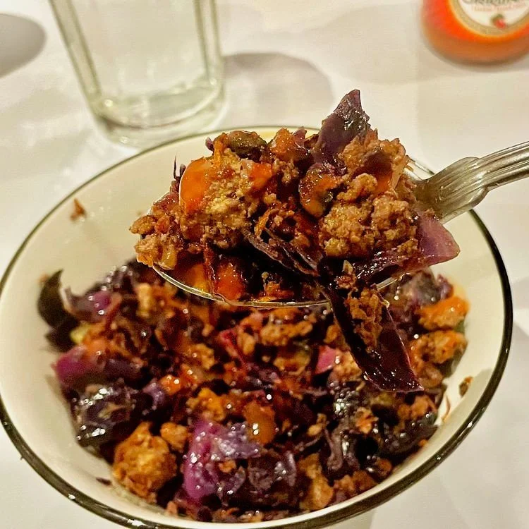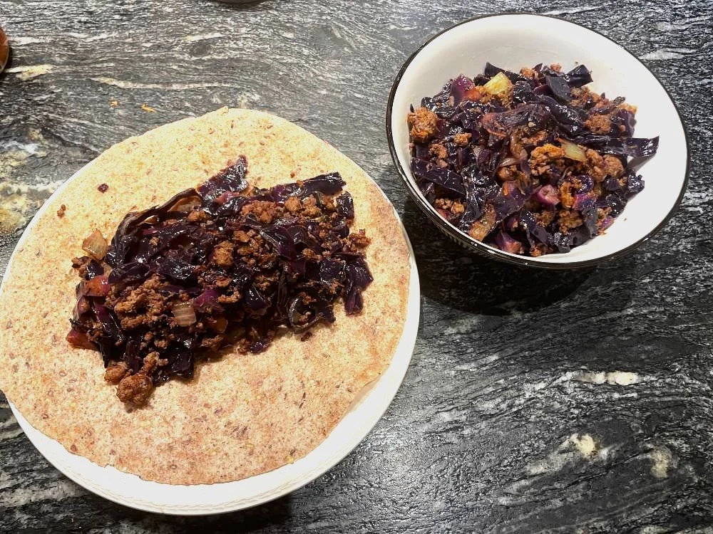 This low carb delicious and nutritious one pot meal is a great recipe to have in your back pocket. The simple ingredients simmer to perfection to soften the cabbage and blend together for a versatile savory dish to that can be served alone, as a rice bowl topping or or in a wrap. cabbage softens to perfection I love to add a drizzle of hot sauce when serving to even further enhance the flavours.