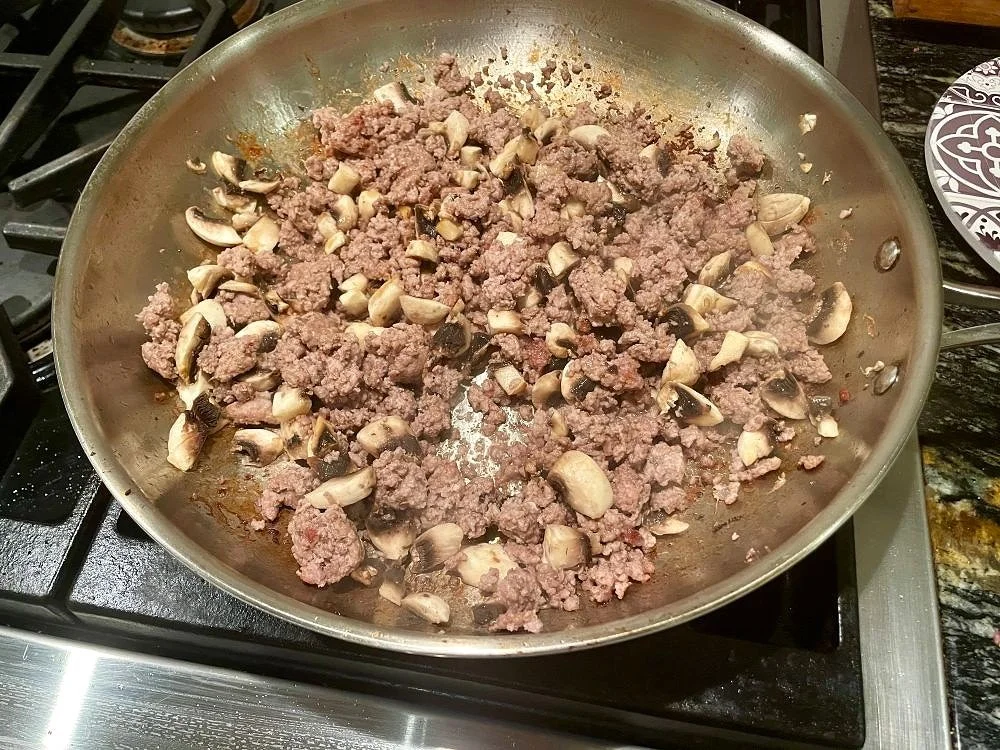 When the oil is hot, turn down the heat to medium and add the beef, veal or the meat of your choice along with the mushrooms, and cook, stirring, until the meat is cooked through and the mushrooms are starting to brown nicely – about 5 minutes.