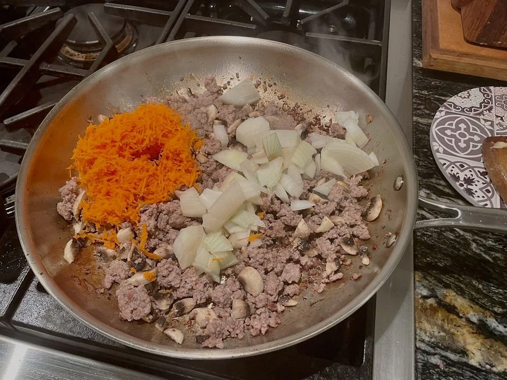 Ad the onion and the carrot and stir to mix these in. Cook, stirring until the onion is soft – about 2 minutes. If the pan becomes dry and the ingredients are starting to stick, add a splash of water and stir to loosen things up.