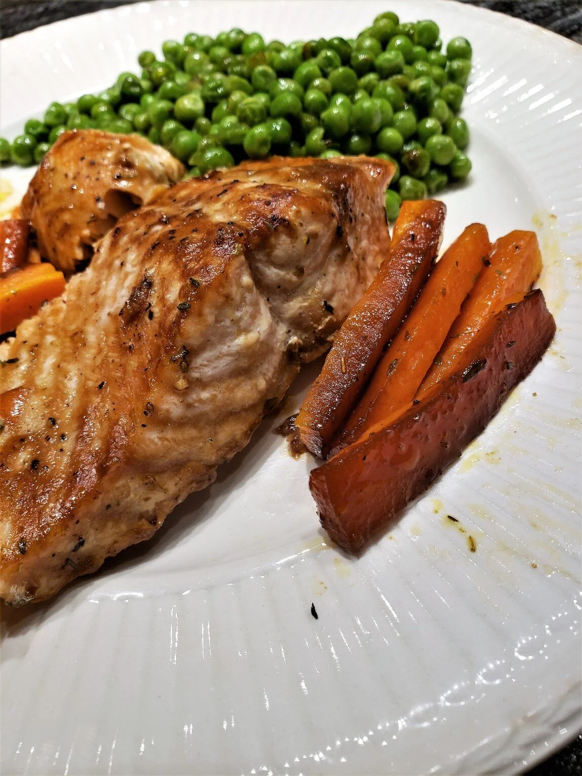 If I make only one colour of roasted veggie with the salmon, I like to add an additional colour to the plate when serving, as in the pan sautéed peas in the photos. A mixed greens salad would work as well.