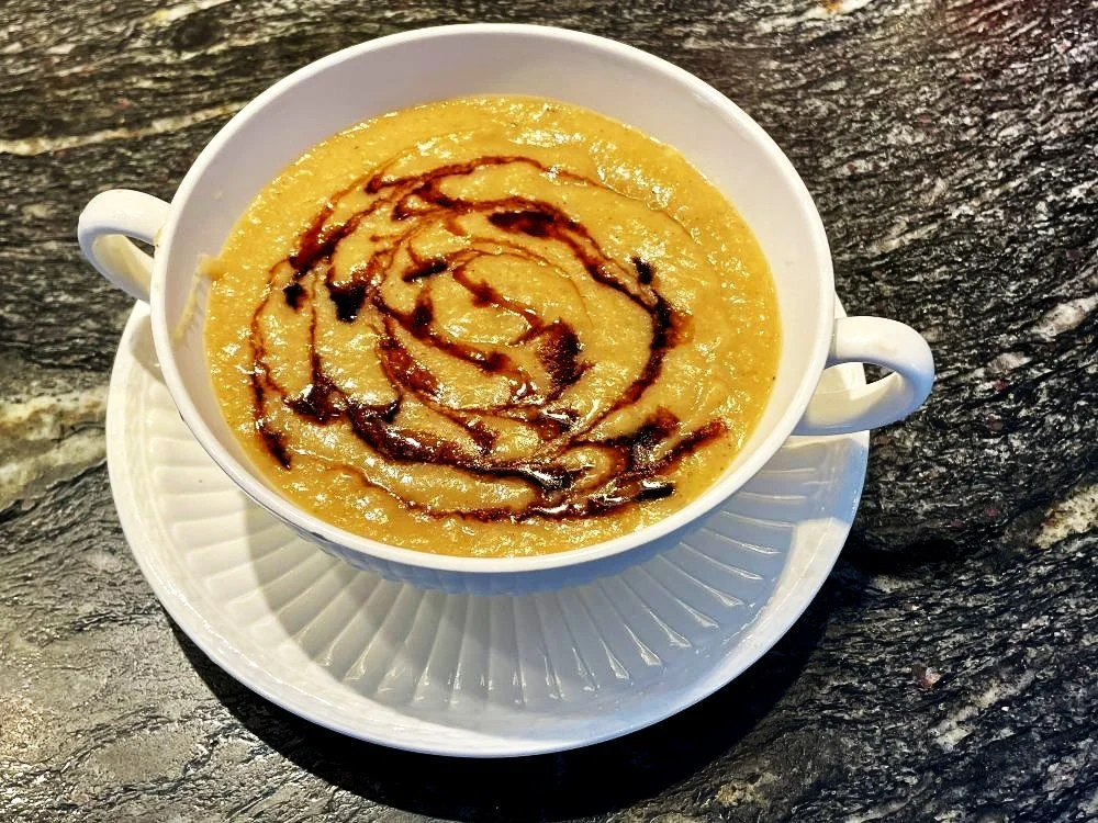 Ladle the soup into pretty bowls, add a drizzle of balsamic vinegar on top and swirl to make a pleasing design. A sprinkle of parmesan or nutritional yeast (for those who have sensitivities to dairy) on top is delicious.