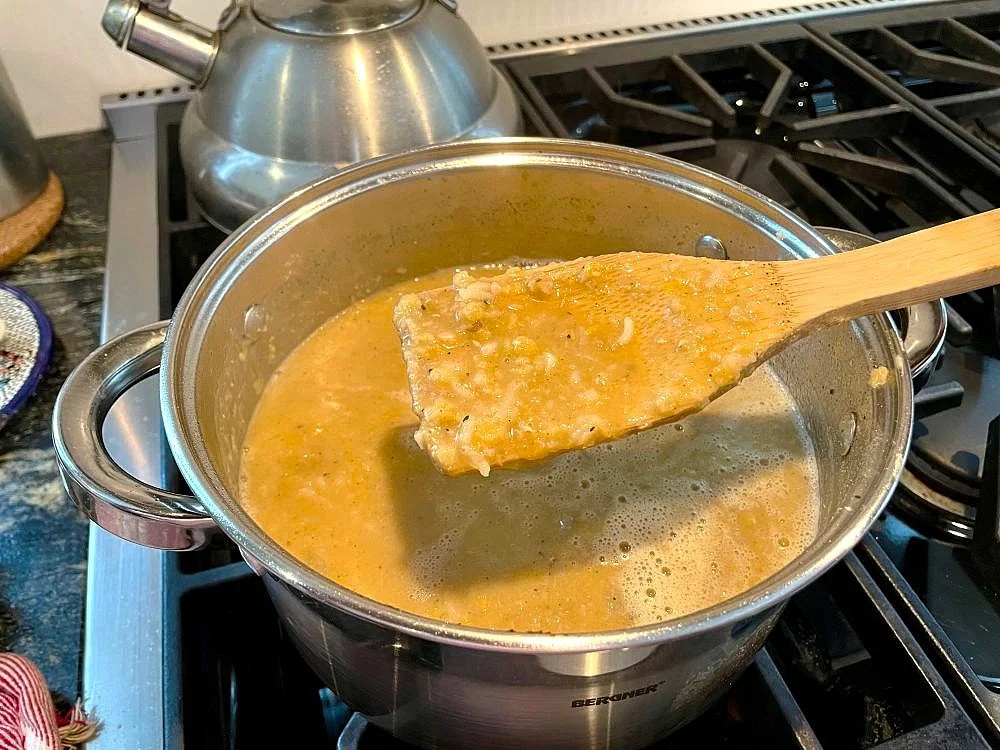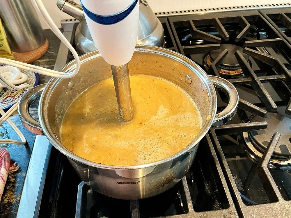 Remove from heat and using an immersion blender, or a regular blender, puree the mixture until it is smooth.