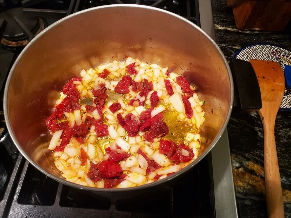 Over medium-high heat, in a large pot, heat the sun-dried tomato oil.
