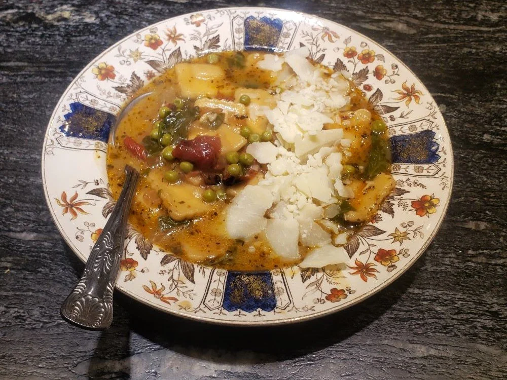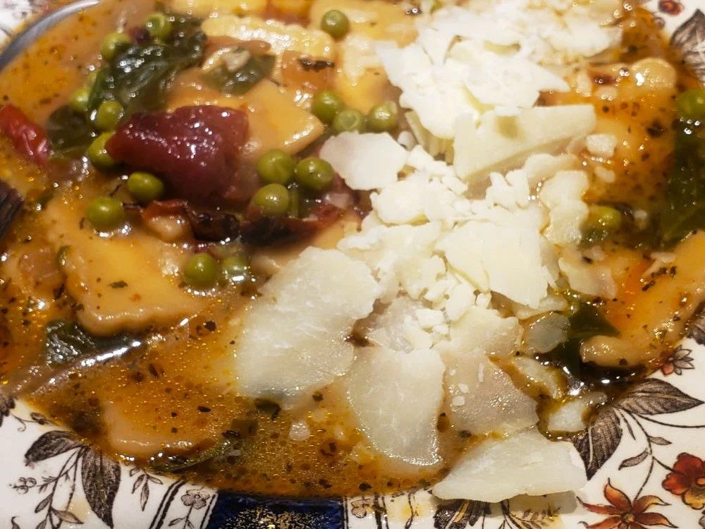 Sun-Dried Tomato and Spinach Soup with Peas and Pasta