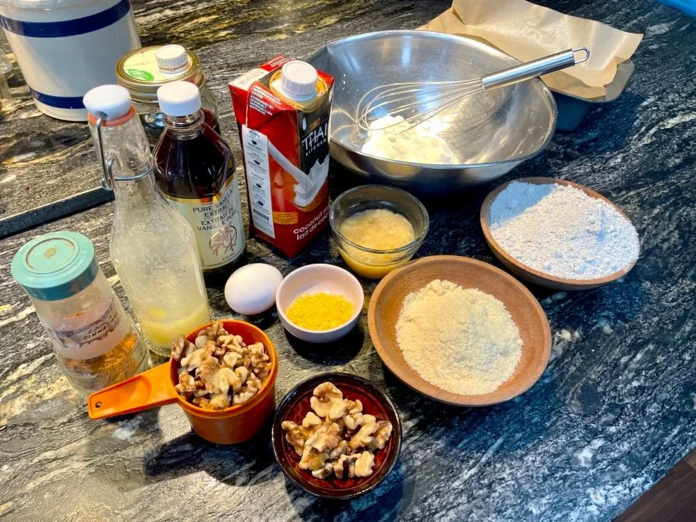 Into the wet mixture, add the oat flour, almond flour, lemon zest, baking powder and sea salt. Stir until well mixed together.